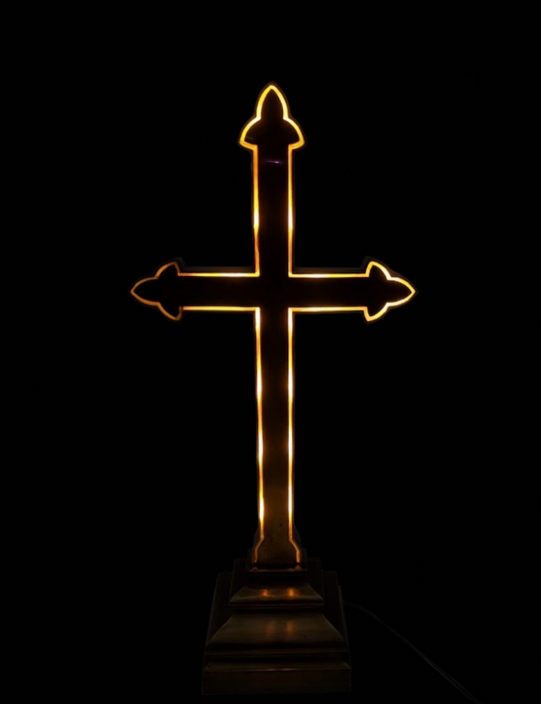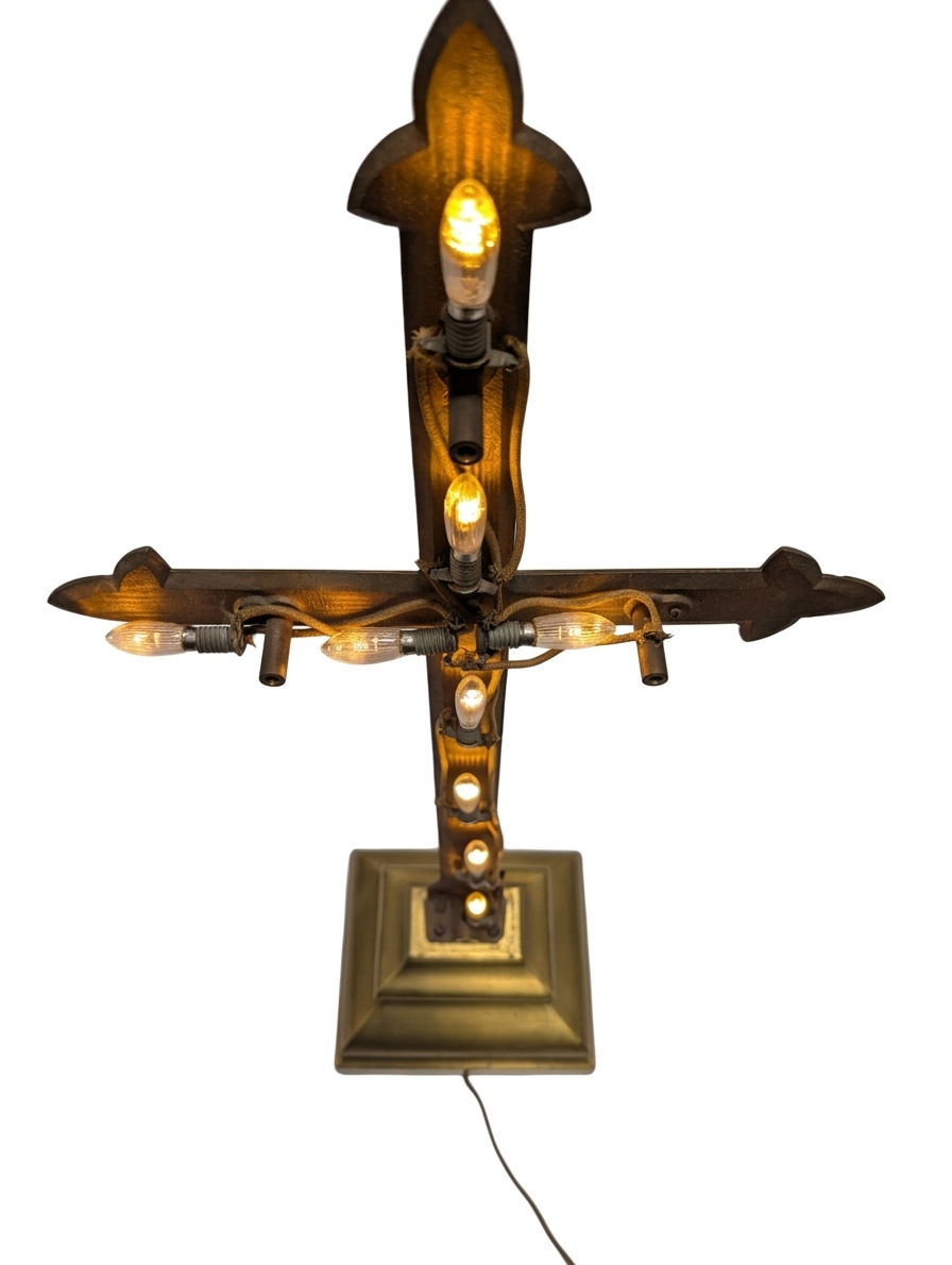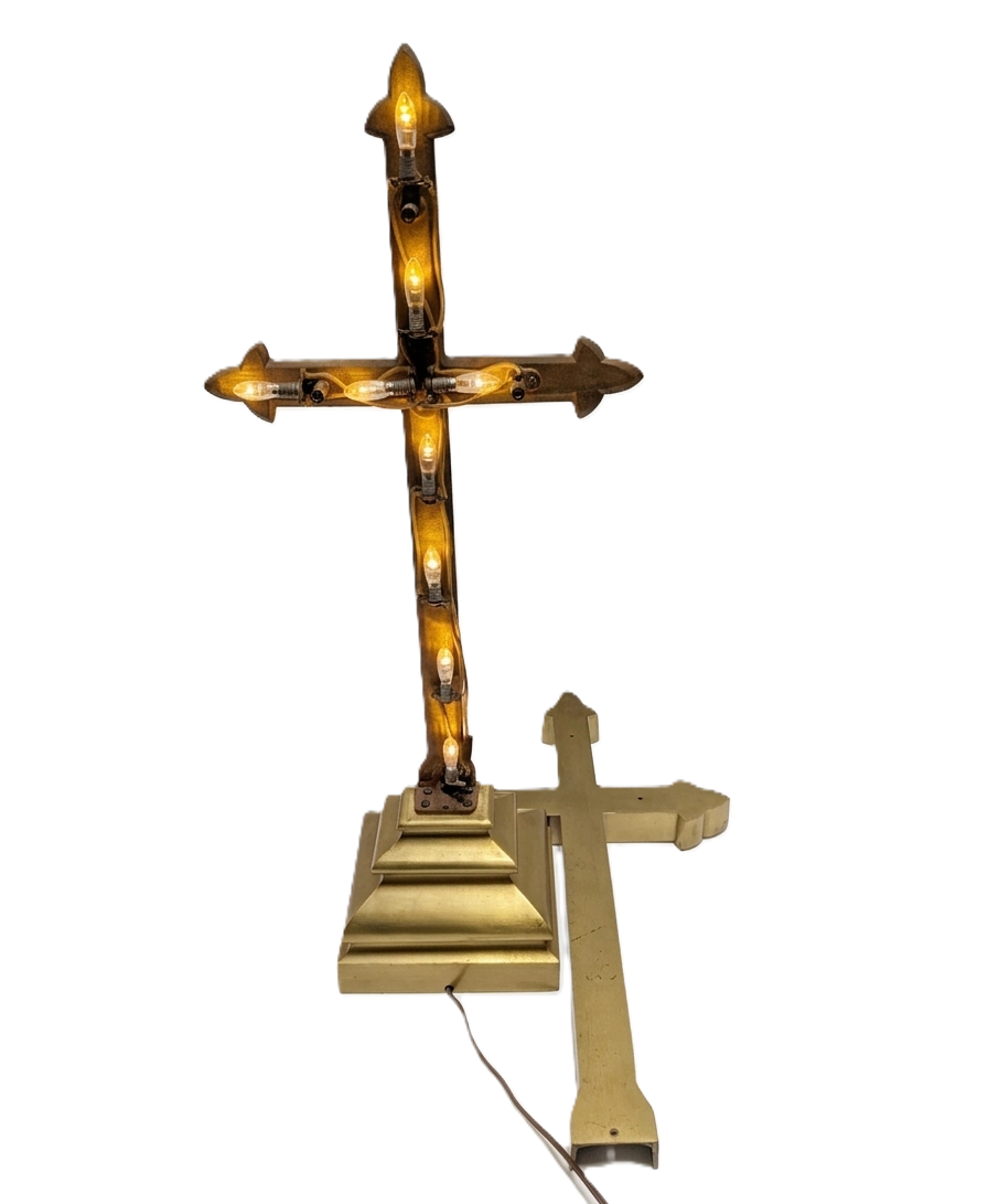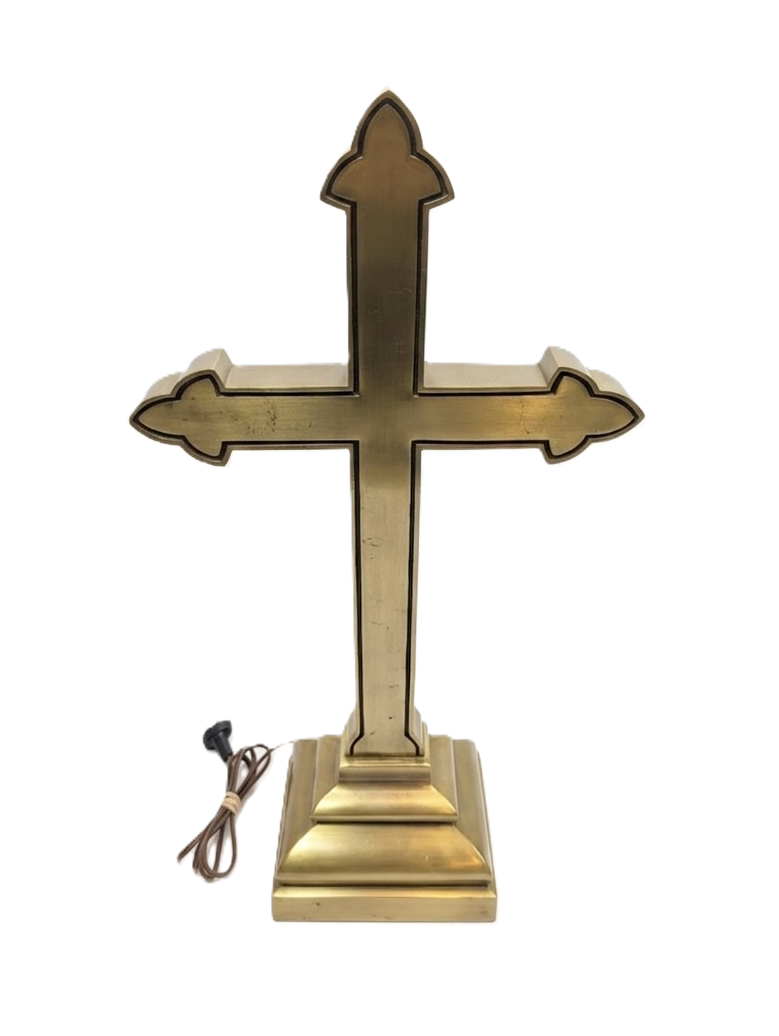 A truly spectacular and exceedingly rare piece of 1930s ecclesiastical salvage. This monumental, solid brass illuminated altar cross stands an impressive 29.5 inches tall and weighs a massive 27 pounds. Designed with a removable front face, the hollow interior houses a candelabra lighting system that creates a breathtaking, glowing “halo” effect from within the brass casing. It is a stunning architectural piece that commands attention whether illuminated or unlit.