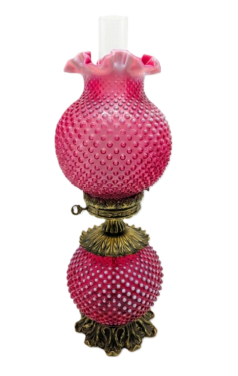 Vintage 1960s Fenton Cranberry Opalescent Hobnail Glass Double Ball Lamp with Original Frosted Chimney